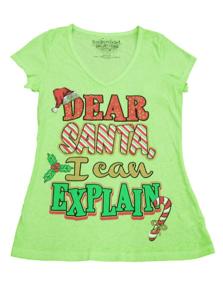 - Rocker Girl Womens Neon Green Dear Santa Christmas Fitted Short Sleeve Shirt