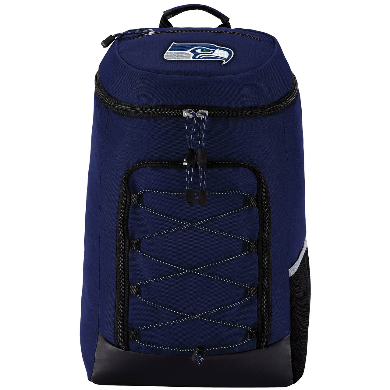 This officially licensed NFL Seattle Seahawks backpack is perfect for the ultimate "Hawks" fan! This top loader multi-purpose 19 inch backpack has navy blue coloring with the Seahawks logo and two toned bungee detail in front. It includes an interior laptop pocket, padded back and adjustable shoulder straps