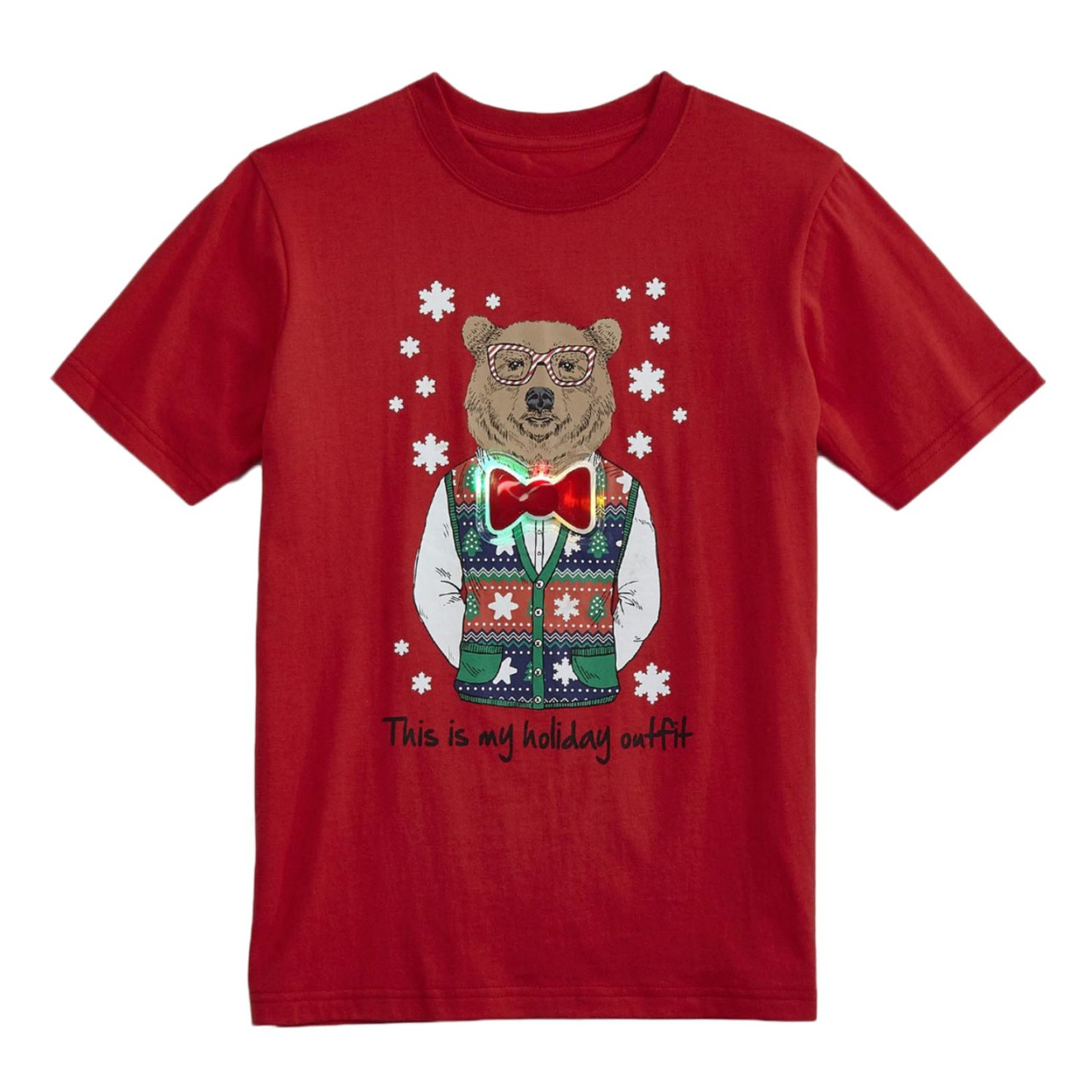 This boy's holiday t-shirt features a Christmas Bear design on front with a light up bowtie. 100% machine washable.