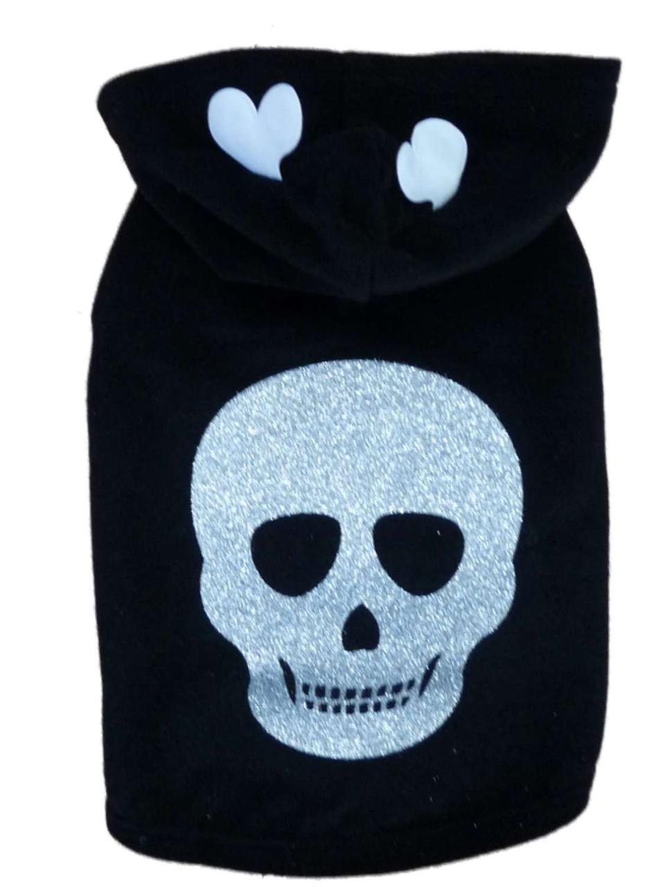 This cozy black fleece hoodie dog costume features a silver glittery skull on the back and has an adjustable strap around the girth. Perfect for your dog's Halloween outing!