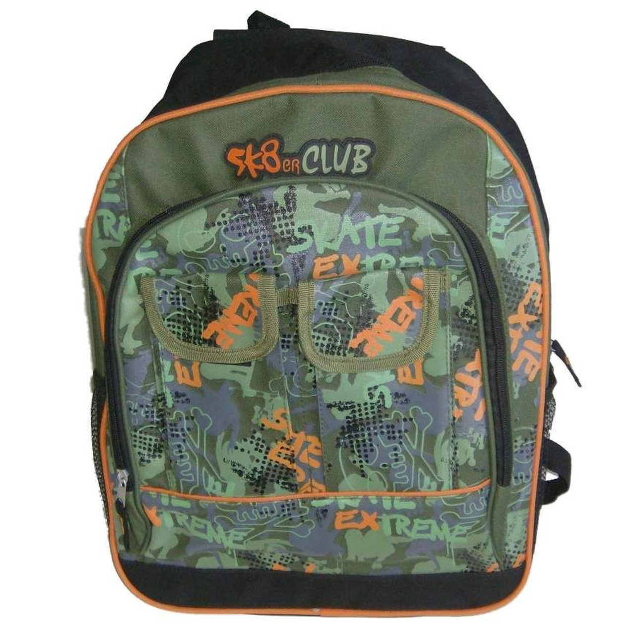 This SK8er Club backpack is green in color with orange and gray accents. It is well made and perfect for day trips or school