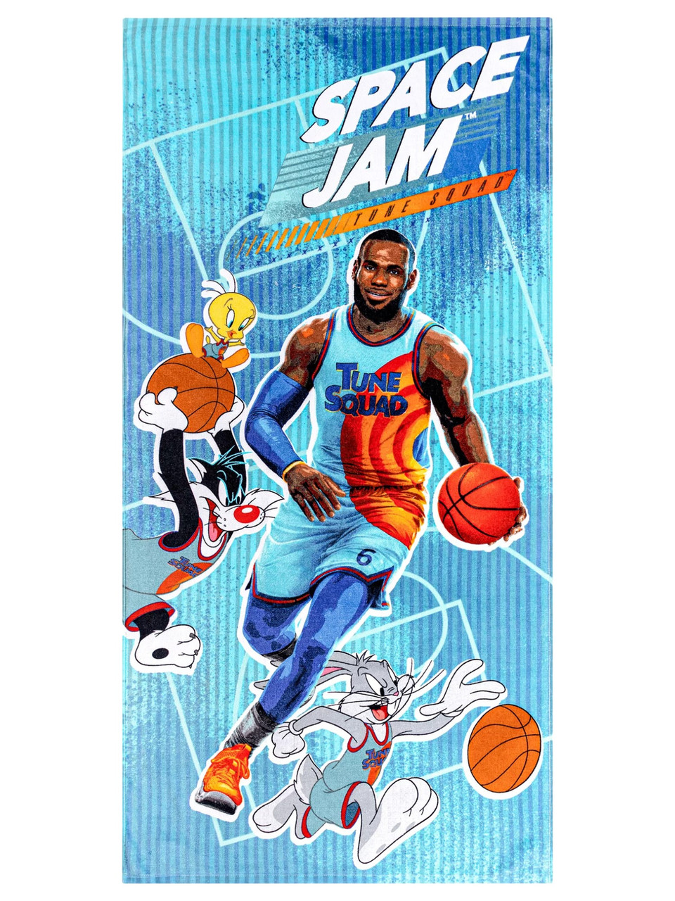 - Features the Tune Squad gang, including LeBron James, Bunny, Sylvester and Tweety on blue background