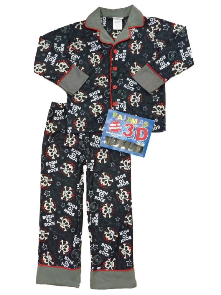 Stylish "Born To Rock" Skull & Crossbones themed flannel pajama set by Steve. Includes 3D glasses!