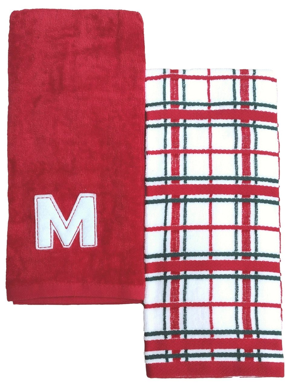 - One towel is solid red with monogram, the other has a Christmas plaid pattern