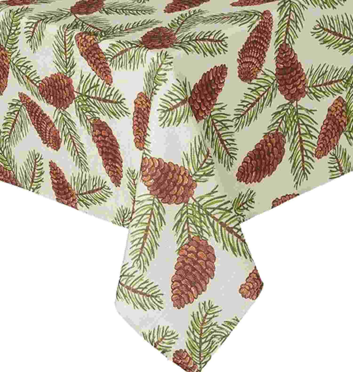 This St Nicholas Square woven fabric tablecloth has a great look. It features a pretty pine cone print on an ivory background. It will add style and elegance to any table