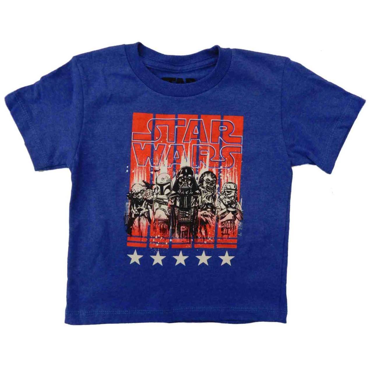 This little boys blue t-shirt features a five star graphic design of the Star Wars characters Yoda, Boba Fett, Darth Vader, Chewbacca and a Stormtrooper.