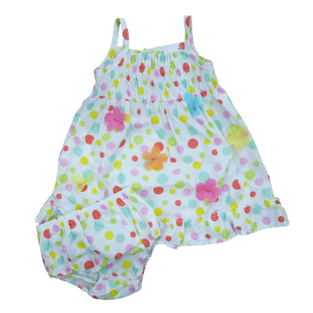 This cute white sundress with multicolor polka dot print has a smocked bodice with back button closure and the skirt is embellished with silk flower accents and a ruffled hem. Infant sizes include a matching diaper cover.