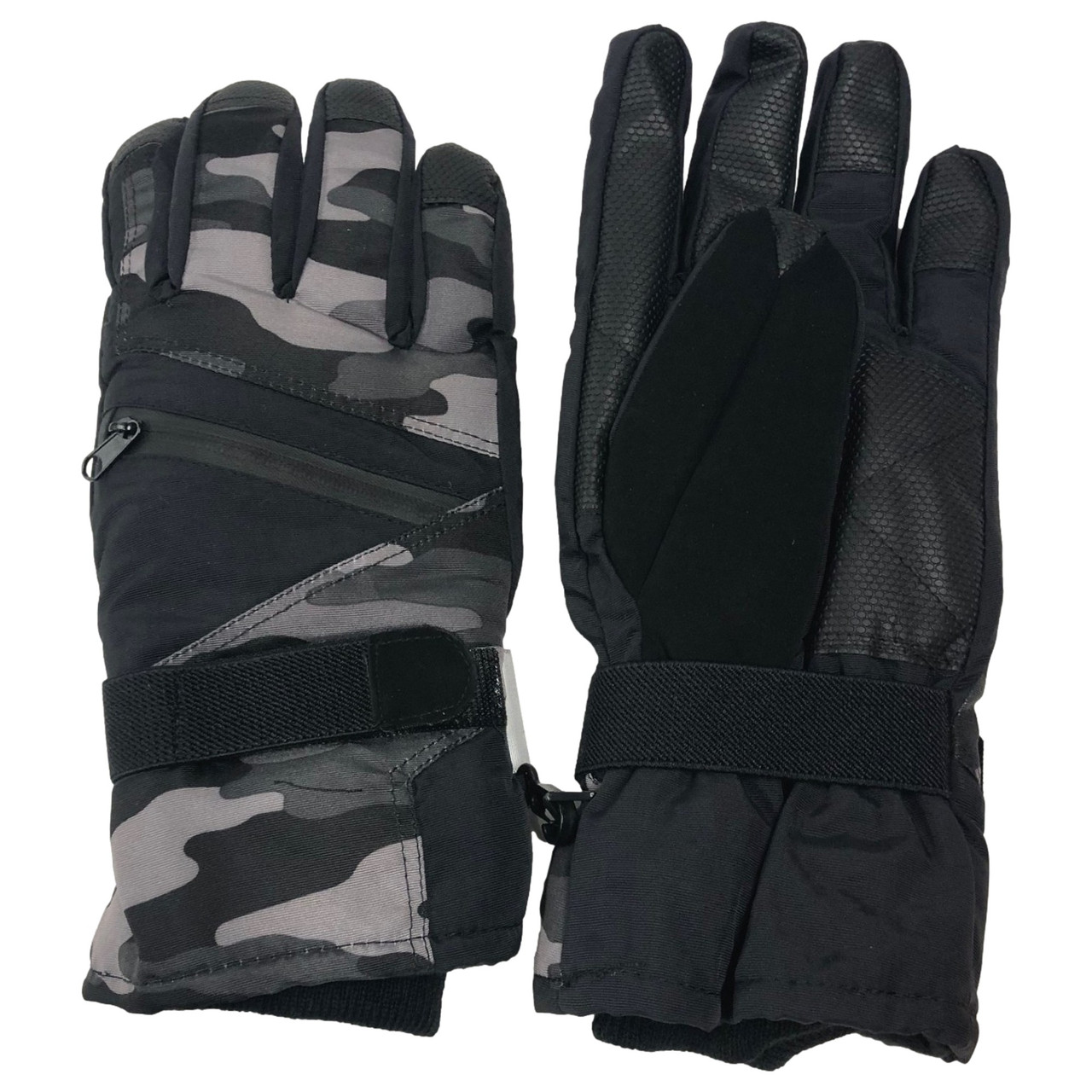 You will stay toasty warm in these Thinsulate insulated gray camo water resistant touchscreen snow & ski gloves. They have adjustable gathered wrists & a zippered pocket for your lift ticket, credit card, or hand warmers!