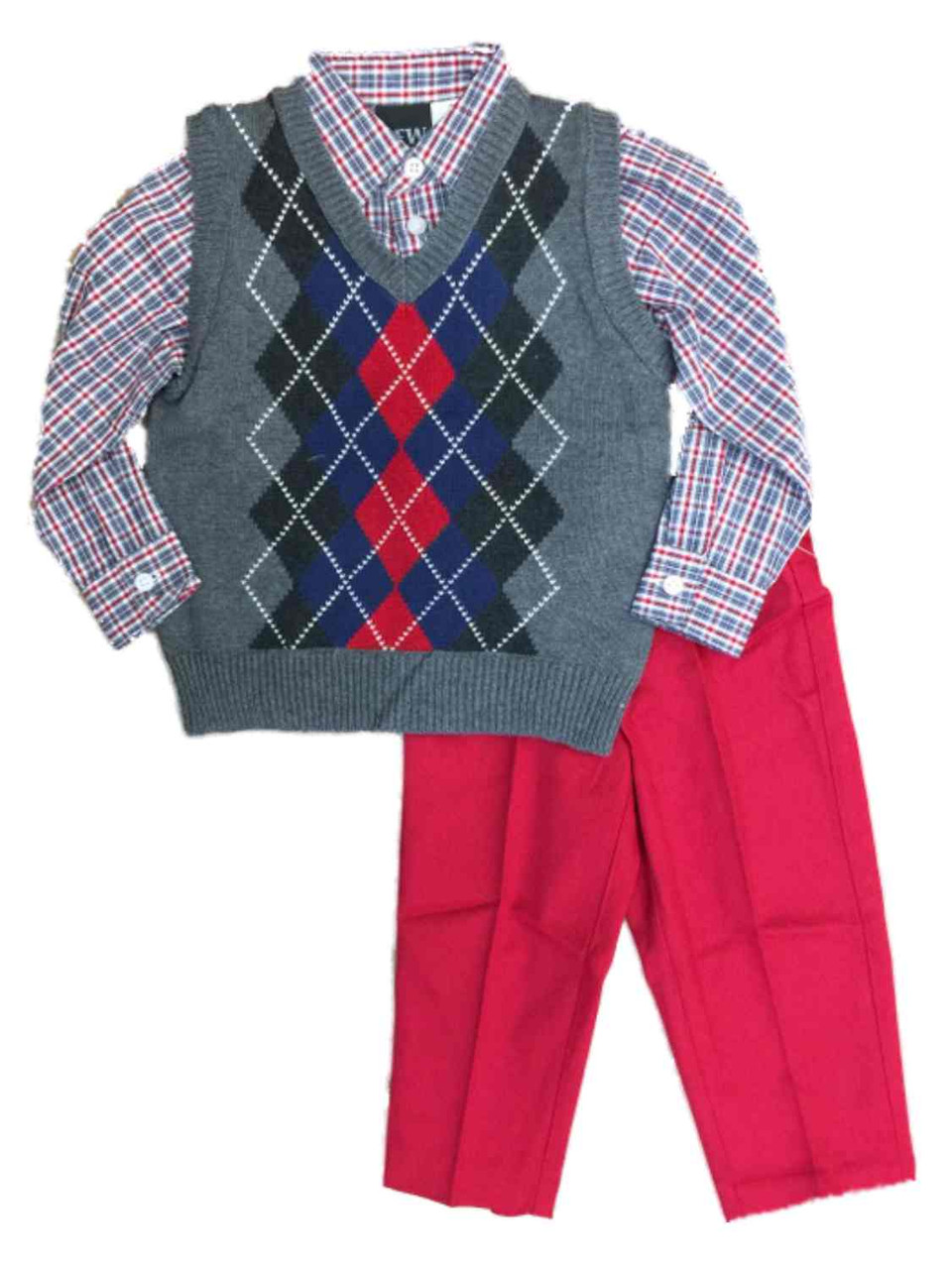 This great looking 3 piece toddler boy's dress up outfit includes an argyle vest, plaid button front shirt, & red pants.