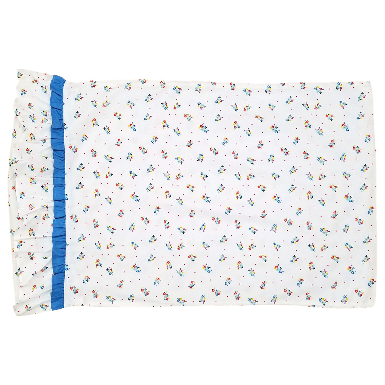 This Pioneer Woman standard size pillowcase pair has a pretty ditsy floral pattern in shades of blue, yellow, red and orange on a white background with blue ruffle accent. They are made from 100% cotton percale