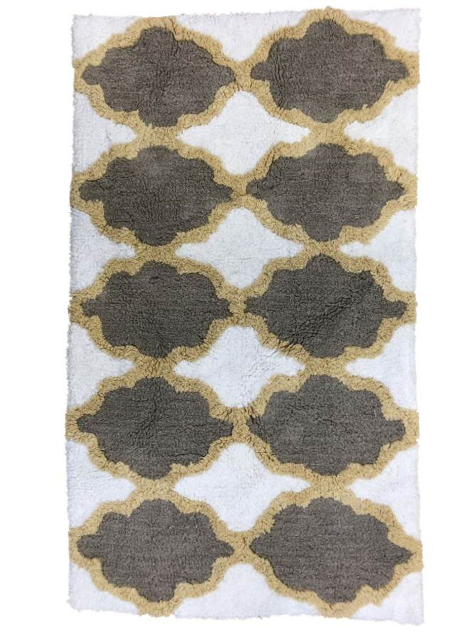 This plush bath rug has a tufted geometric pattern in shades of brown, gold and ivory. It is soft and durable with a skid resistant stitched back