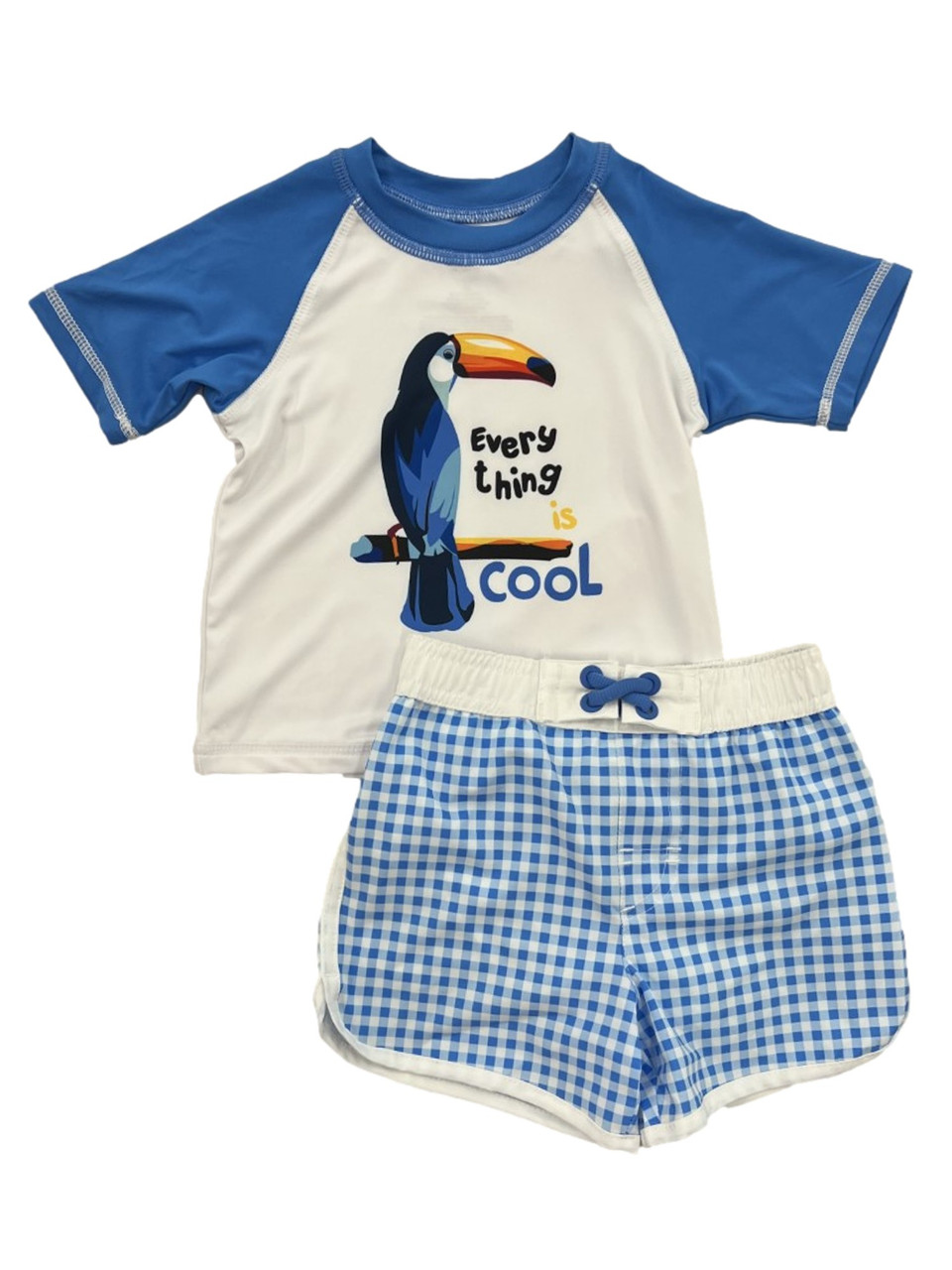 - Toddler Boy Blue & White Every Thing Is Cool Toucan Rash Guard & Swim Trunks