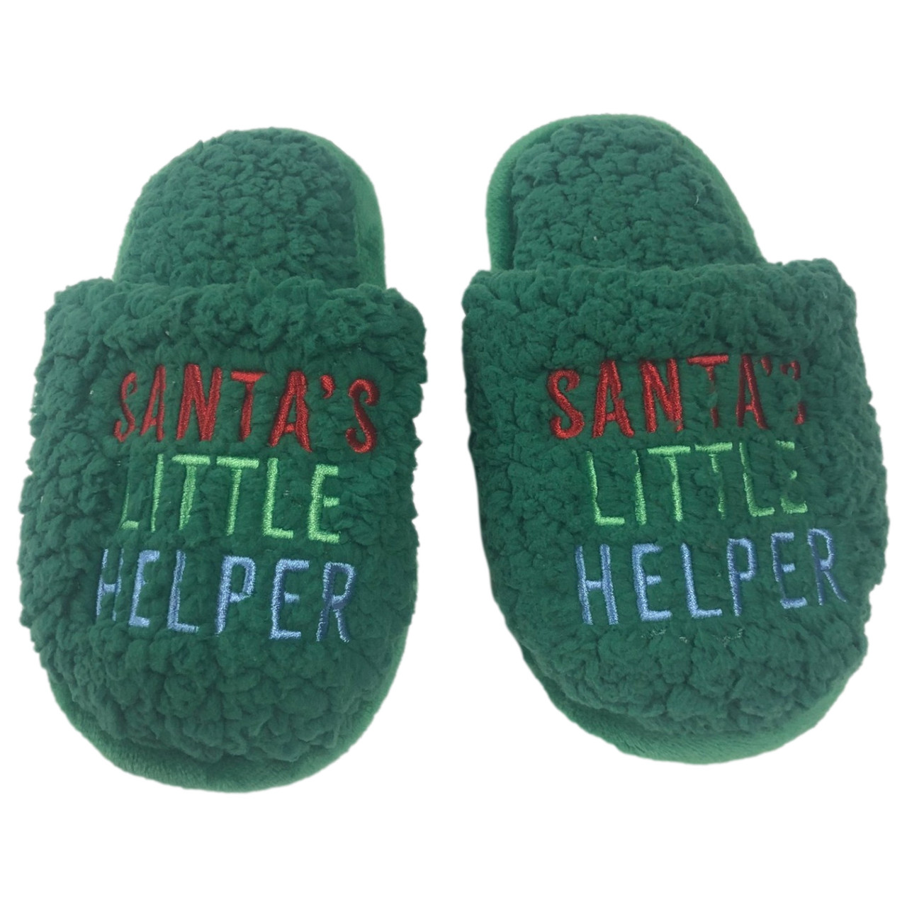 Your little one will love wearing these cozy green plush sherpa "Santa's little helper" themed Christmas slippers around the house!