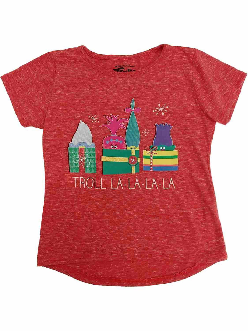 This cute red Trolls Christmas shirt has Poppy & friends hiding behind presents & is sure to be a favorite!