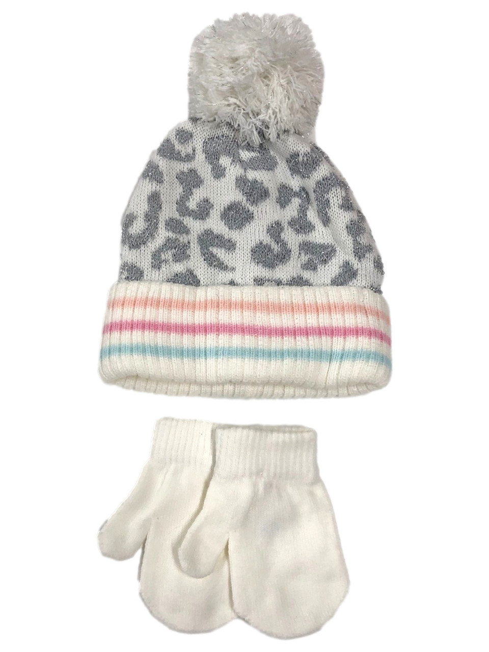 - Toddler Girls White & Silver Leopard Print Winter Beanie Hat & Mittens Set