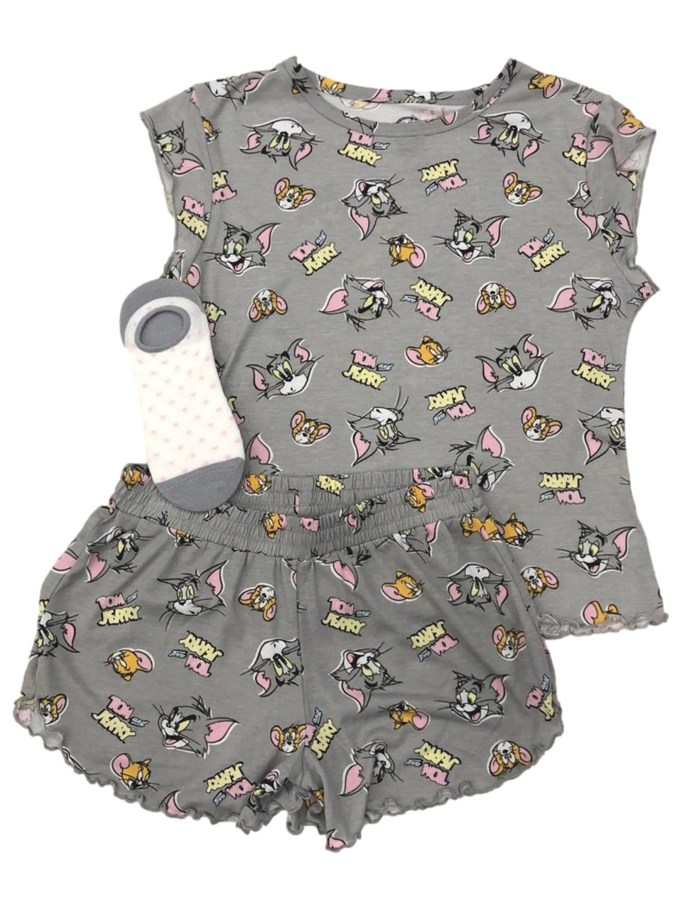 - Tom & Jerry Womens Gray Cat & Mouse Tee Shorts & Socks Pajamas Sleep Set