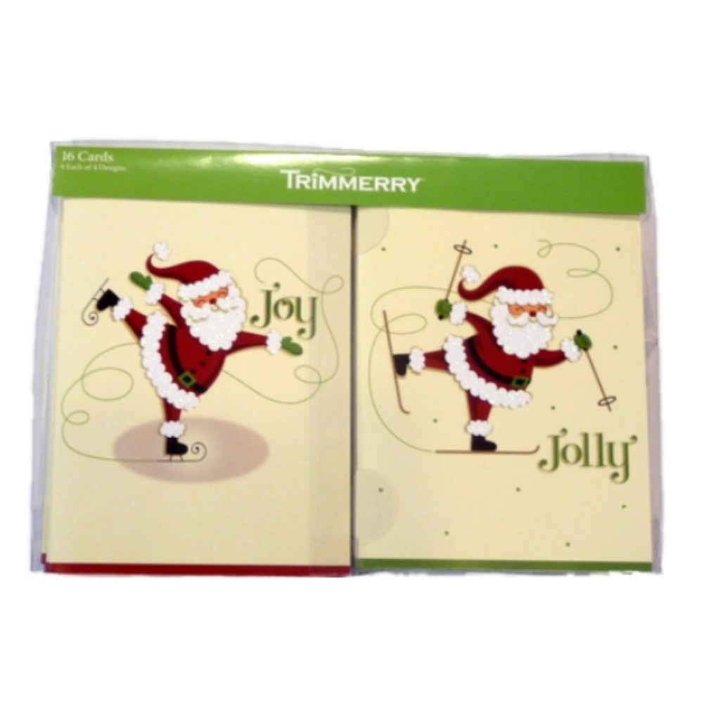 This set of Santa Christmas cards include 4 different types: Santa sledding with the word, "Merry". Santa making a snow angel with the word, "Peace". Santa ice skating with the word, "Joy". And Santa skiing with the word, "Jolly".