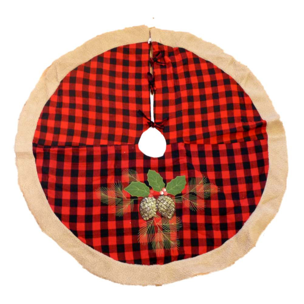 This gorgeous red plaid Christmas tree skirt features faux fur trim glittery pinecones, stitched pine branches, and holly leaves with red button holly berries.