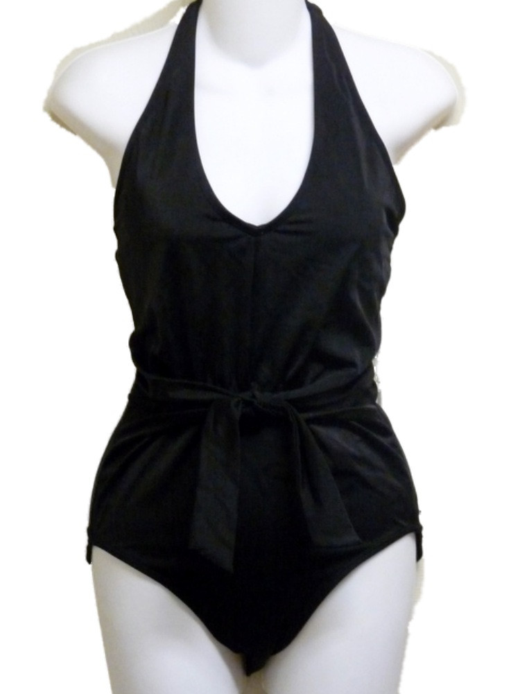 This elegant black one piece halter style bathing suit has a gathered knot front and is very flattering on any figure!