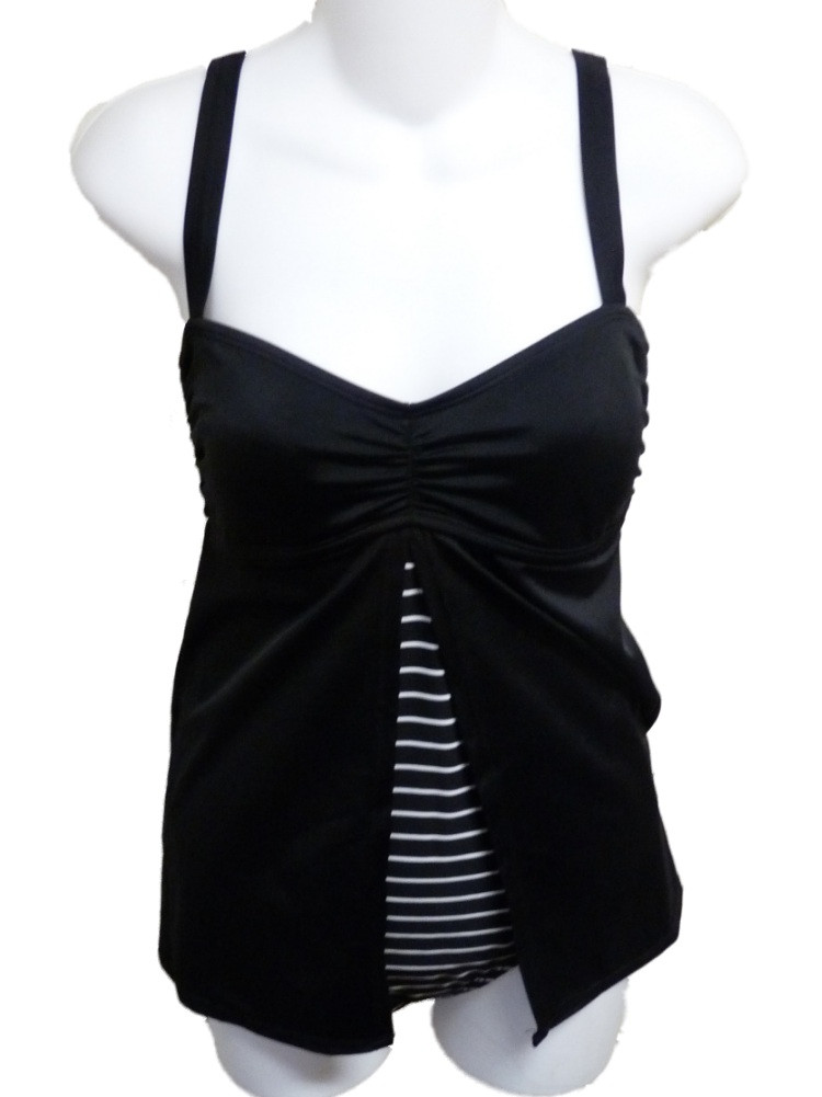 This pretty swim dress has a black fly away top over a black with white striped under suit. The straps are adjustable and the cups are ruched.