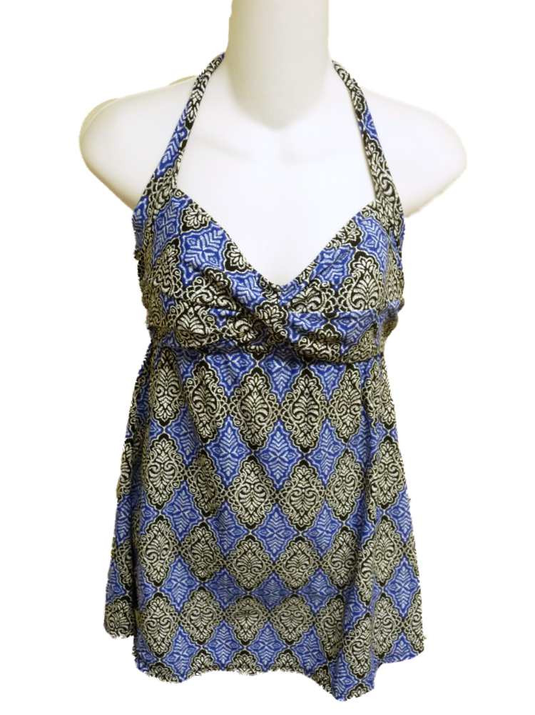 This pretty blue, black, and white ornamental print halter swim dress has a gathered twist on the cups and ties around the neck.