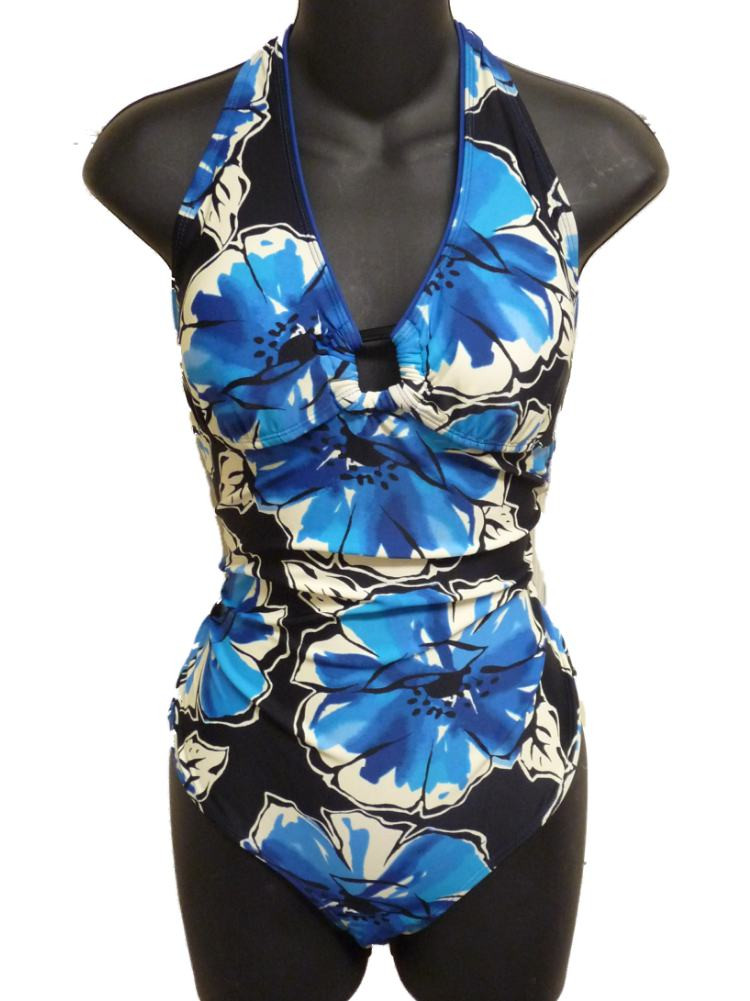 This attractive blue, white, and black tropical print one piece halter style bathing suit ties at the back and neckline.