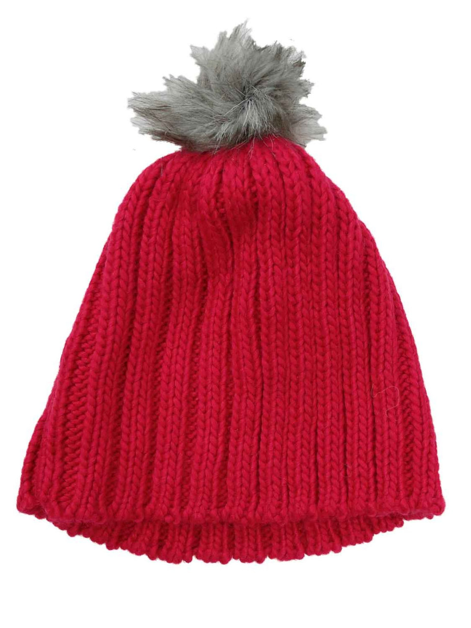 This chunky pink knit stocking cap features a fuzzy faux fur pom pom top for a playful look!