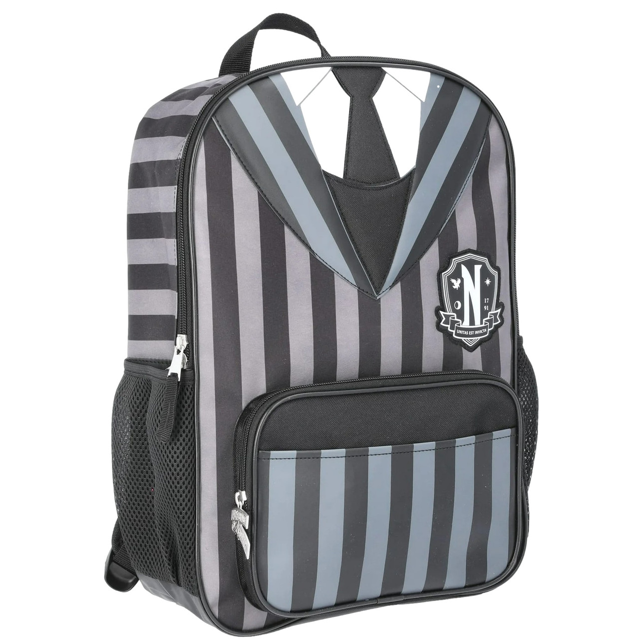 This darling Wednesday 17 inch Backpack has a Nevermore uniform graphic pattern with black and white stripes. The backpack has a large main compartment with interior padded laptop sleeve. It is just what you need for going back to school