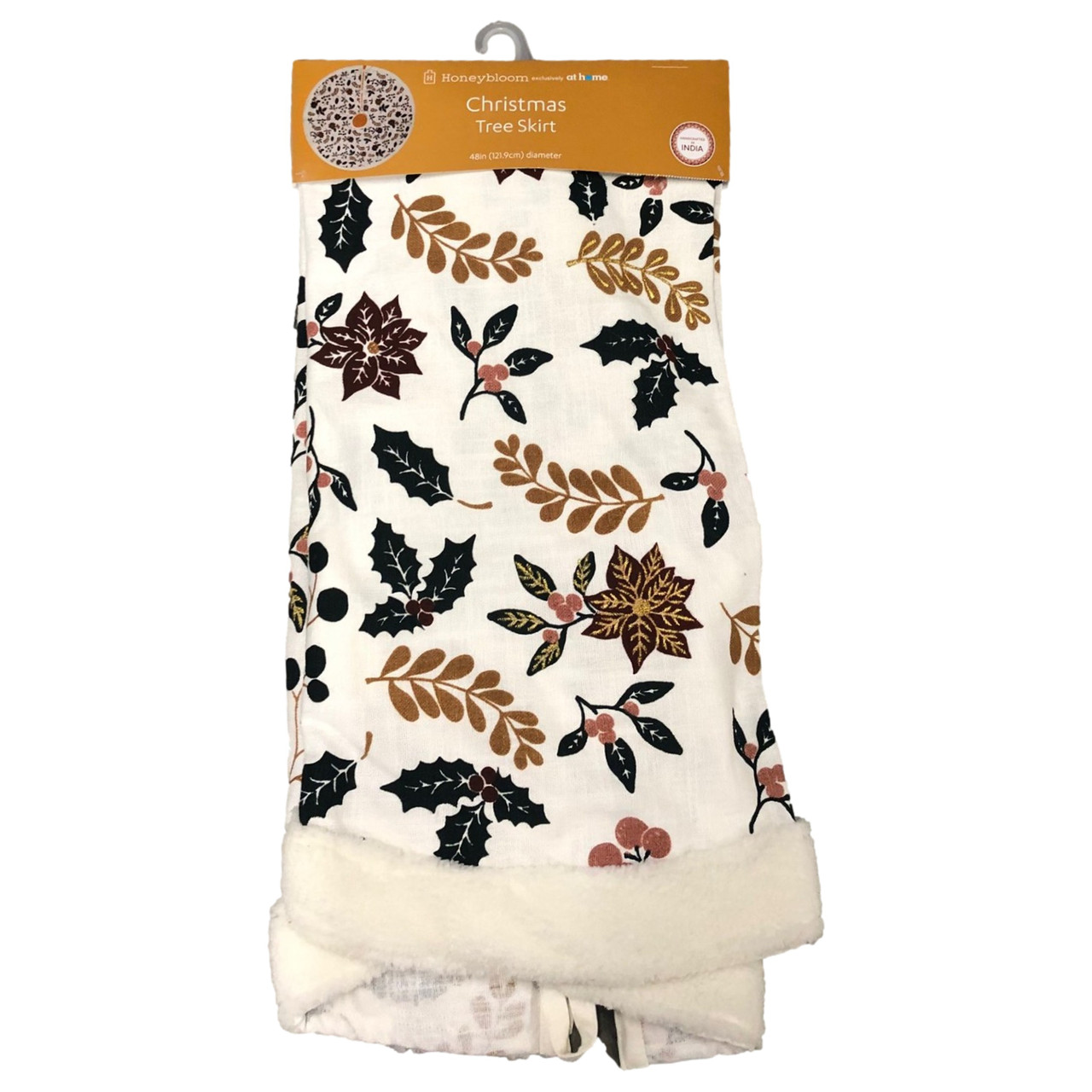 - White Sparkle Holly Leaf Print Poinsettia Christmas Tree Skirt 48 Inch