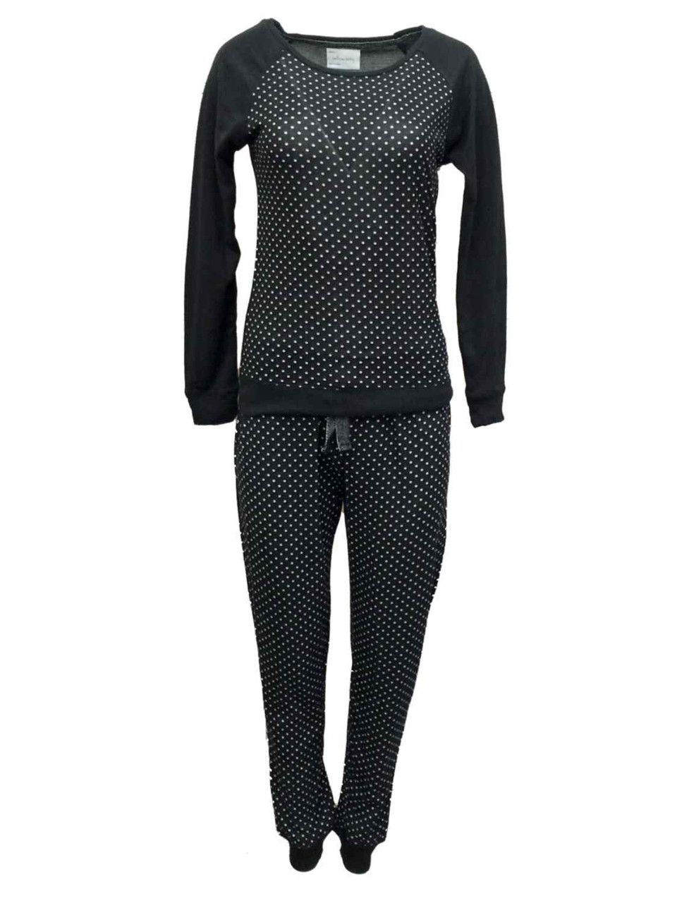 This super soft black & white polka dot pajama set features a long sleeved pajama top and elastic and drawstring waist pajama bottoms.