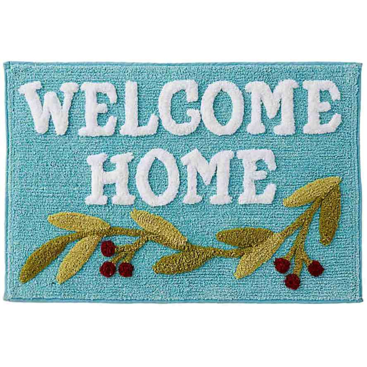 - Soft, plush bathroom rug features "Welcome Home" sentiments on a blue background with tufted mistletoe accents