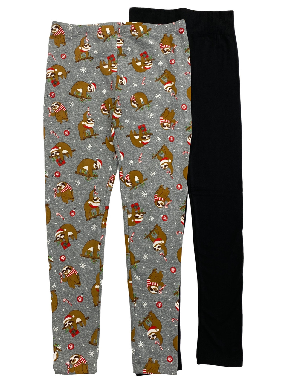 You will love the look and feel of these soft fleece lined elastic wait leggings. Includes a black pair and a fun gray sloths, snowflakes, & candy canes print!