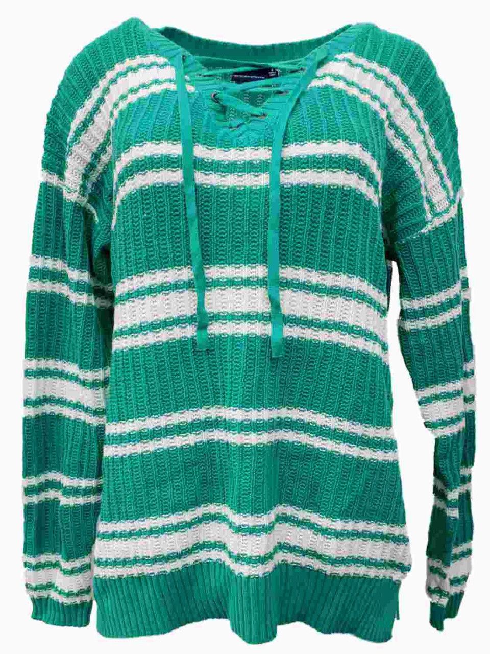 - Womens Aqua & White Stripe Laced V Neck Knit Cotton Sweater Shirt Top
