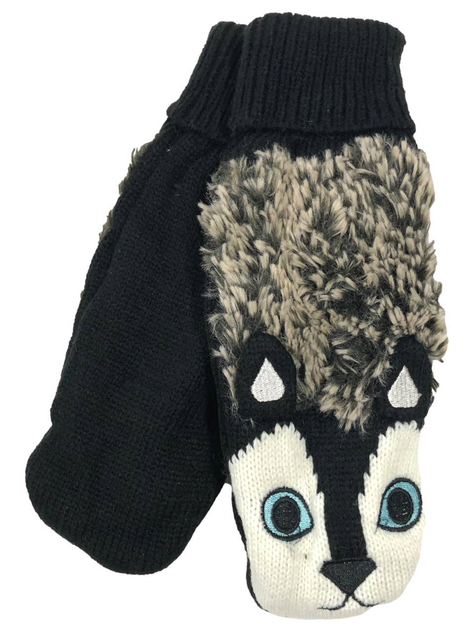 You will love wearing these fun black acrylic knit puppy dog themed mittens with plush linings!