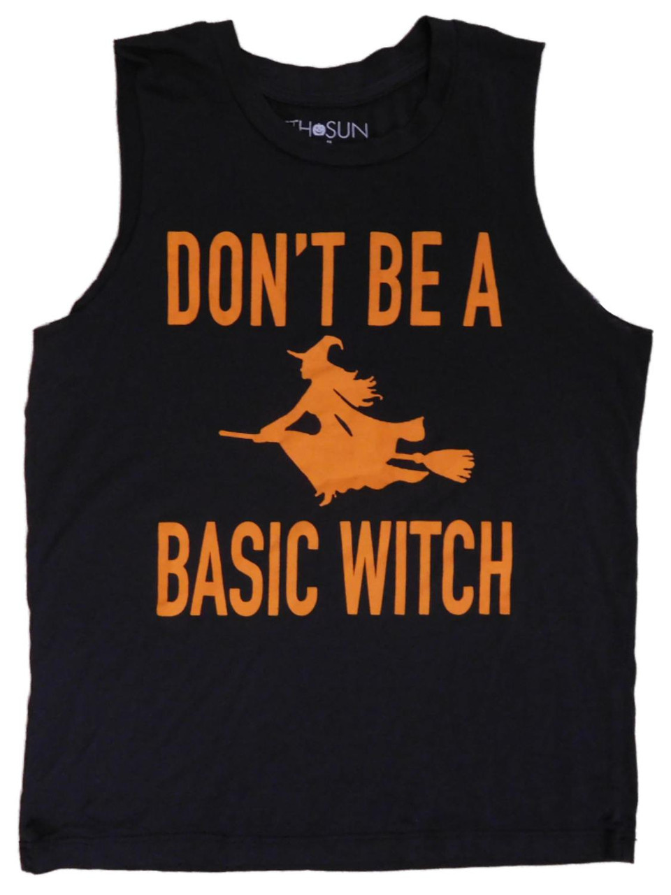 This fun semi-sheer "Don't be a basic witch" tank top is sure to be a Halloween favorite!