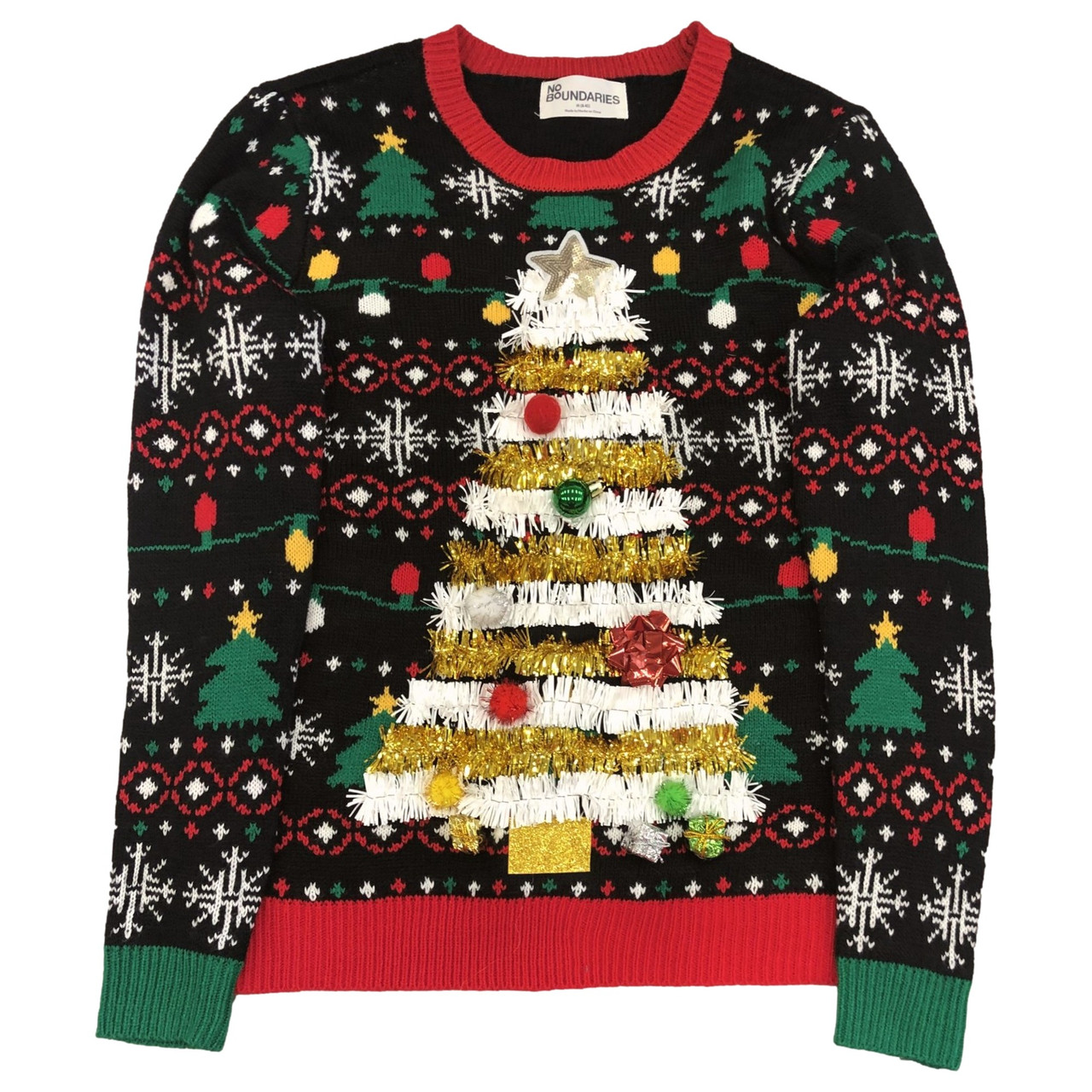 - Womens Black & Gold Tinsel Christmas Tree Holiday Sweater