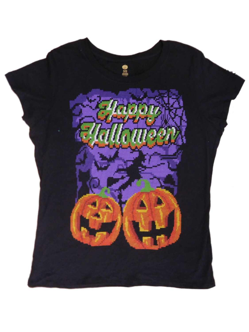 - Womens Black Happy Halloween T-Shirt Pixelated Pumpkin & Witch Tee Shirt