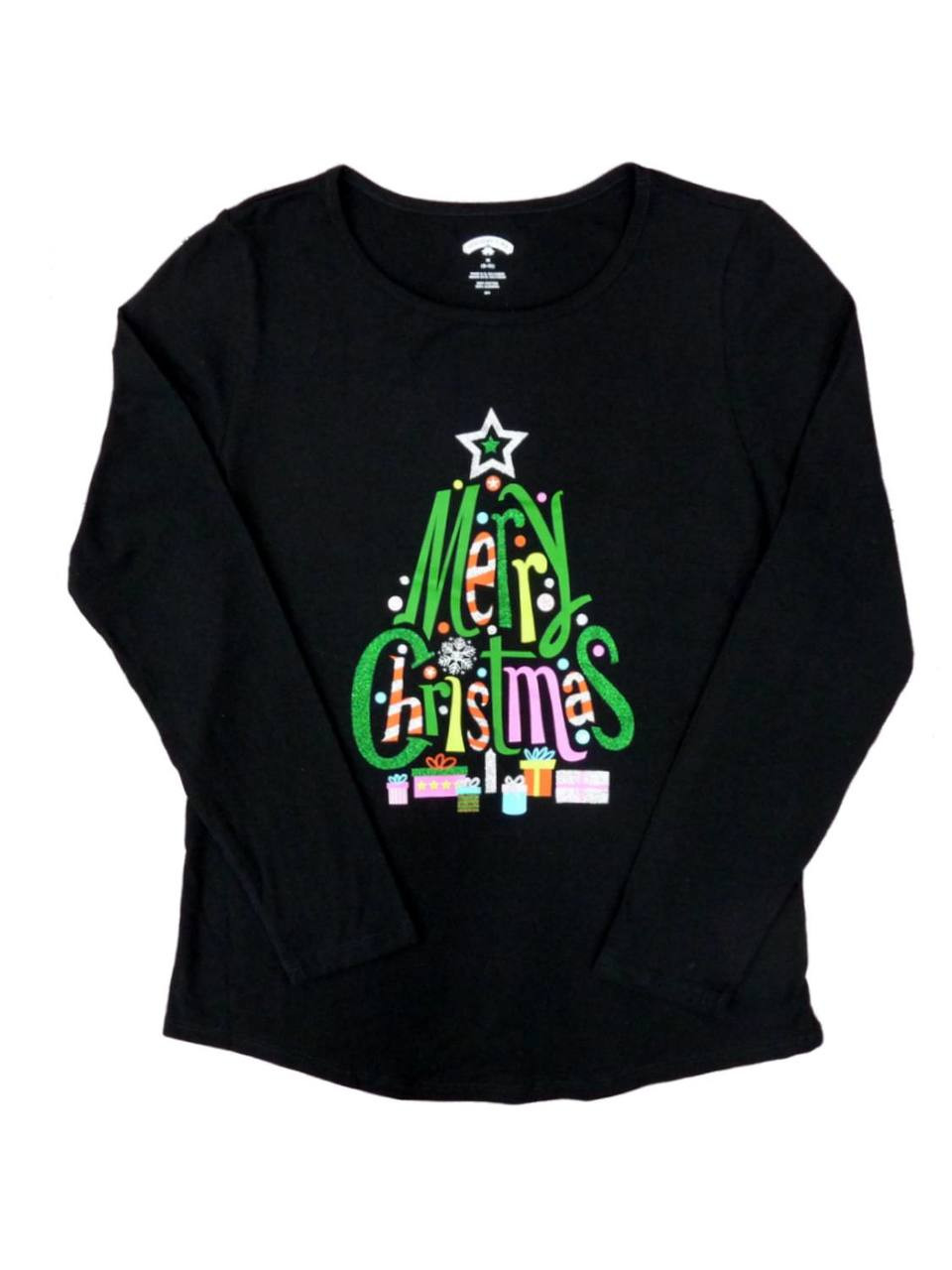- Womens Black Merrry Christmas Holiday T-Shirt Glittery Tree Tee Shirt