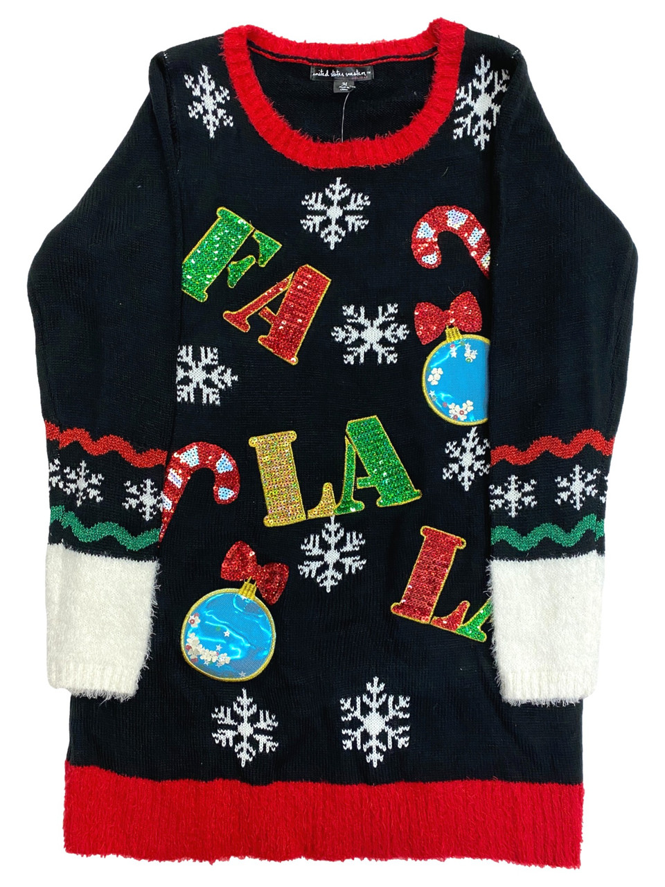 - Womens Black Sequin Embellished Fa La La Christmas Holiday Sweater