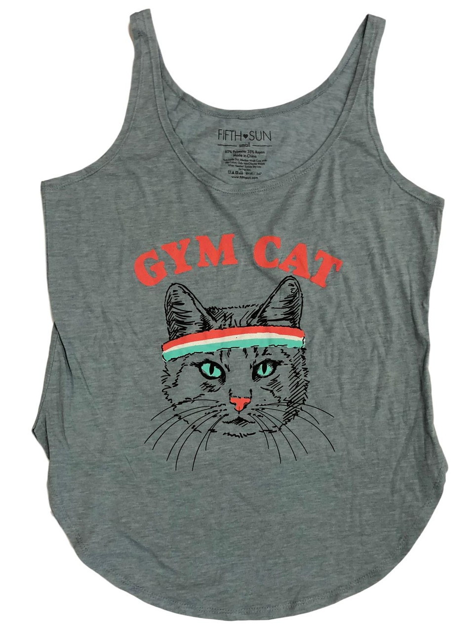 You will be ready to work out in this fun loose fitting "Gym Cat" tank top!