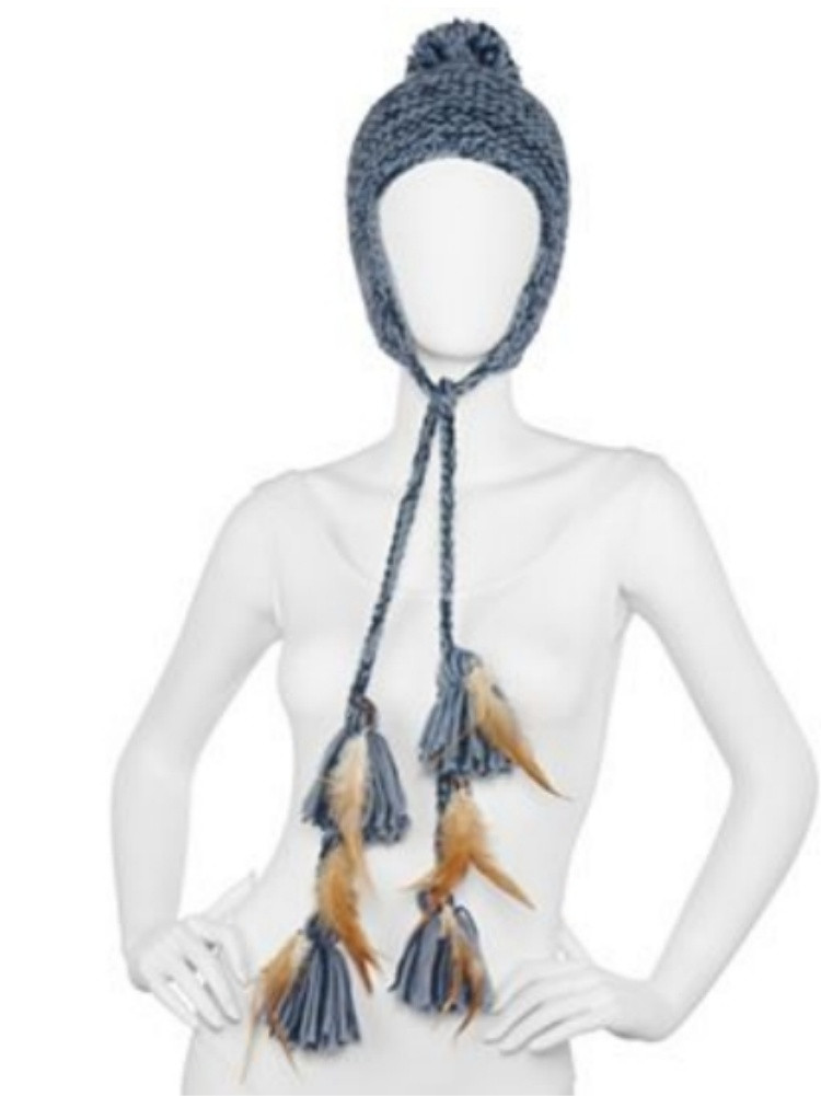 This cozy blue knit trapper hat has a pom pom topper, covered ear flaps, braided tassels, and feather detailing.