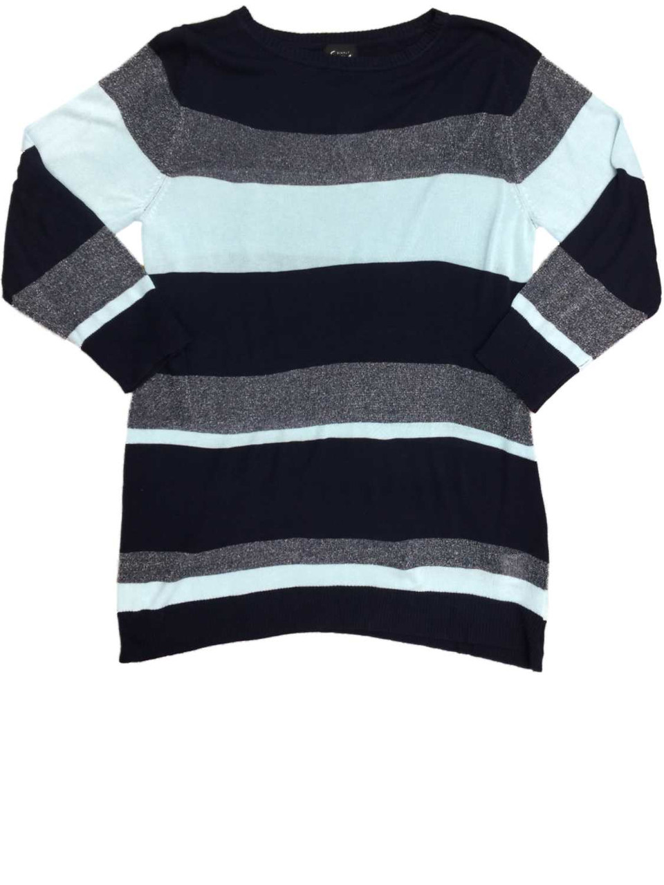 - Womens Blue Navy & Silver Striped Knit Bedazzled Sweater Casual Dress Pullover