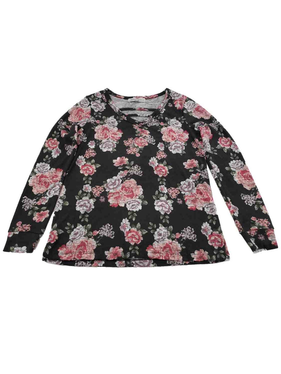- Womens Charcoal Grey and Pink Floral V Neck Long Sleeve Shirt Top Sweater