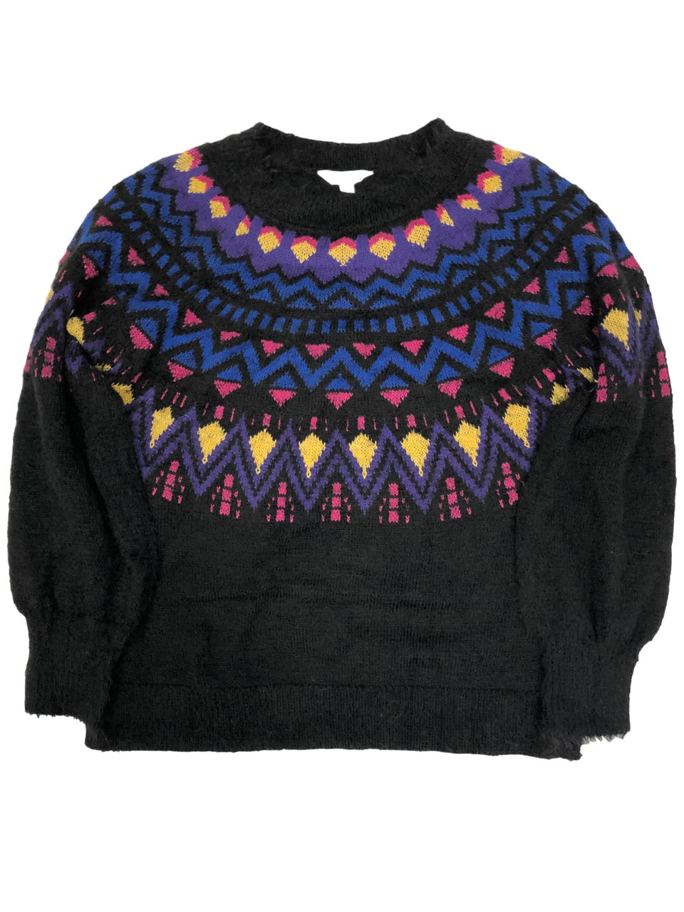 You will love the cozy feel of this pretty black, pink, & blue sweater!