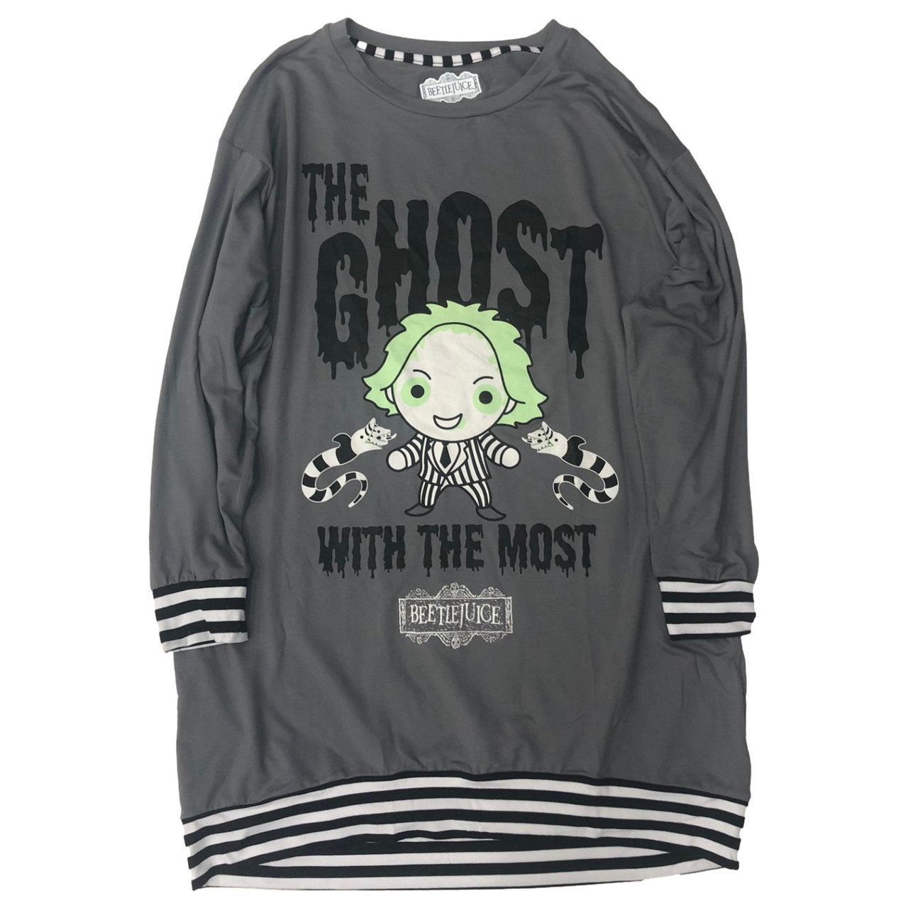 You will love wearing this cozy long sleeved gray Beetlejuice ghost themed Halloween sleepshirt to bed!