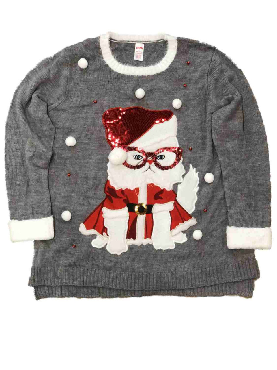 - Womens Gray Kitty Cat Santa Claus Sequin Holiday Christmas Sweater