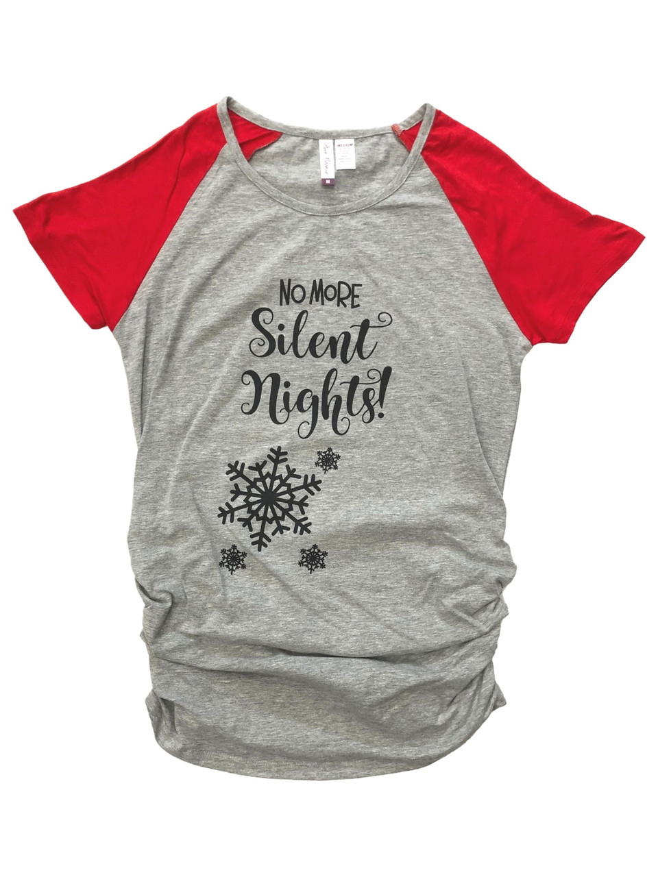You will be ready for the holidays in this fun gray & red short sleeved "No more Silent Nights" ruched fit maternity t-shirt!