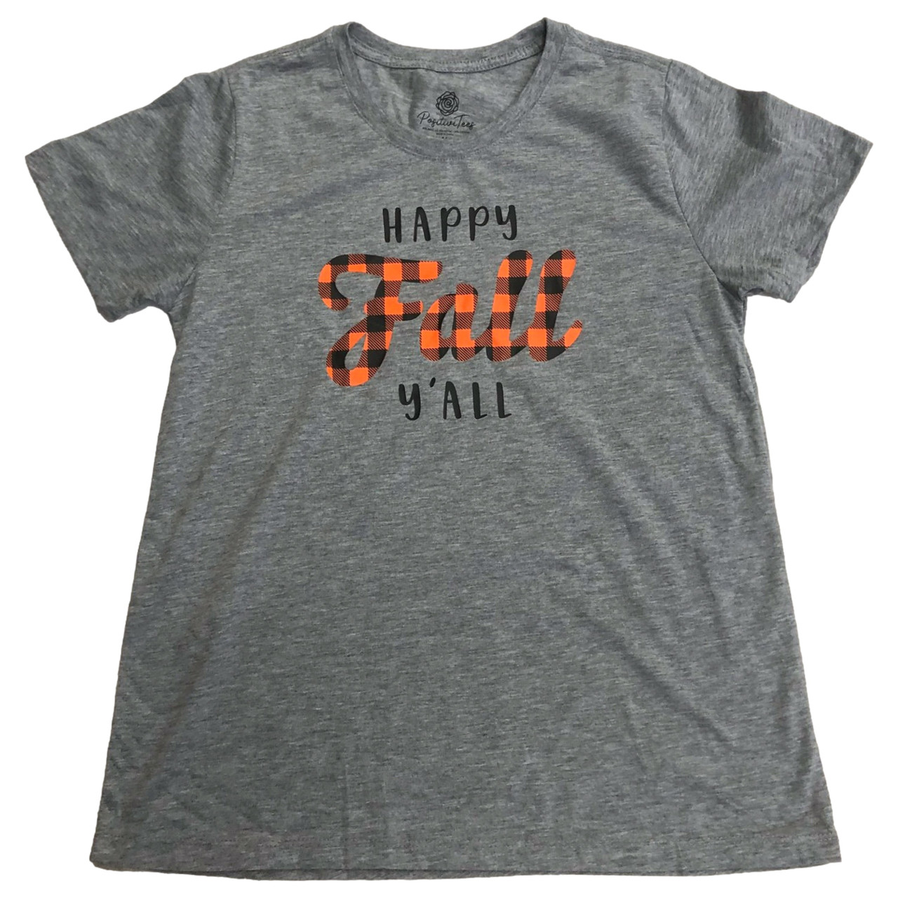 - Womens Gray & Orange Plaid Happy Fall Y'all Autumn Tee Shirt T-Shirt
