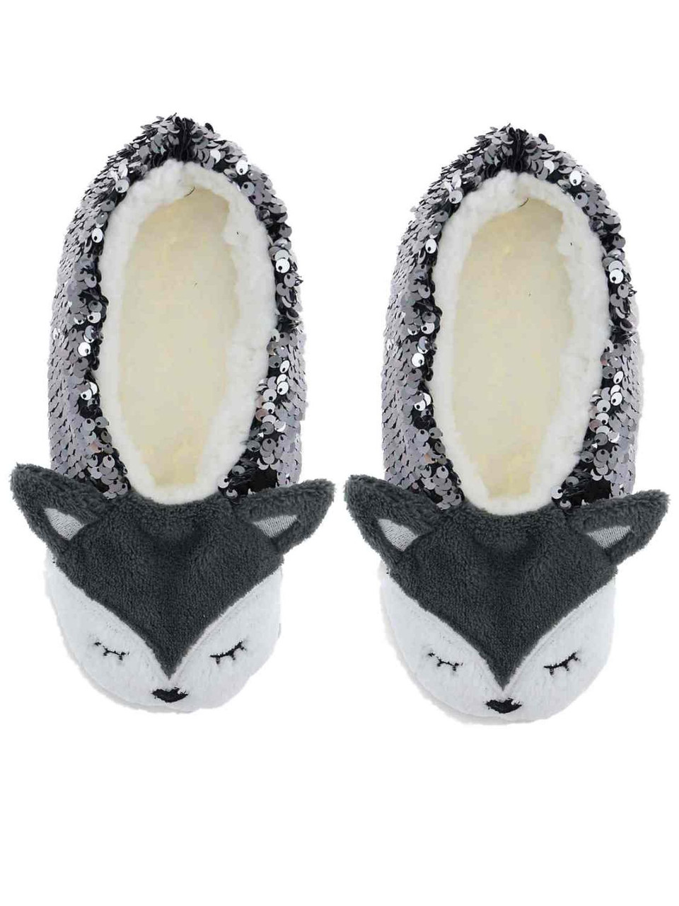 You will love the cozy feel of these plush gray sequin fox slippers!