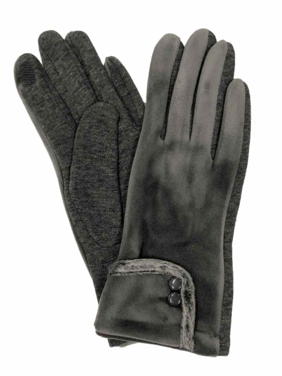 You will like the look and feel of these pretty gray velvety soft button trimmed stretch fit texting gloves!